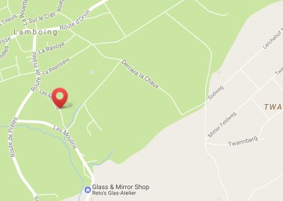 Après le restaurant Reto’s Glas-Atelier (sur votre gauche). Vous découvrez un hameau sur votre droite. Tournez à droite au début du hameau puis tout de suite à gauche. Traversez le hameau. Continuez tout droit. Le moulin est en haut du hameau sur votre droite. Ce hameau se situe avant d’arriver à la scierie et bien avant le village.